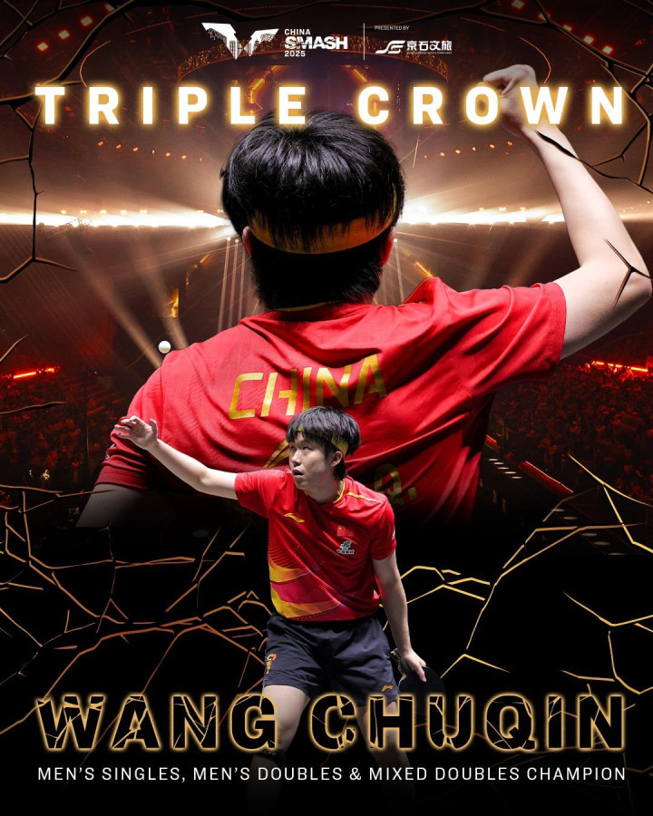 在昨日的中国大满贯男单决赛,头号种子王楚钦4-0战胜7号种子菲利克斯-勒布伦,首夺中国大满贯男单冠军和今年第二个WTT大满贯冠军。在混双中与孙颖莎搭档获得混双冠军,随后与林诗栋搭档拿下男双冠军。